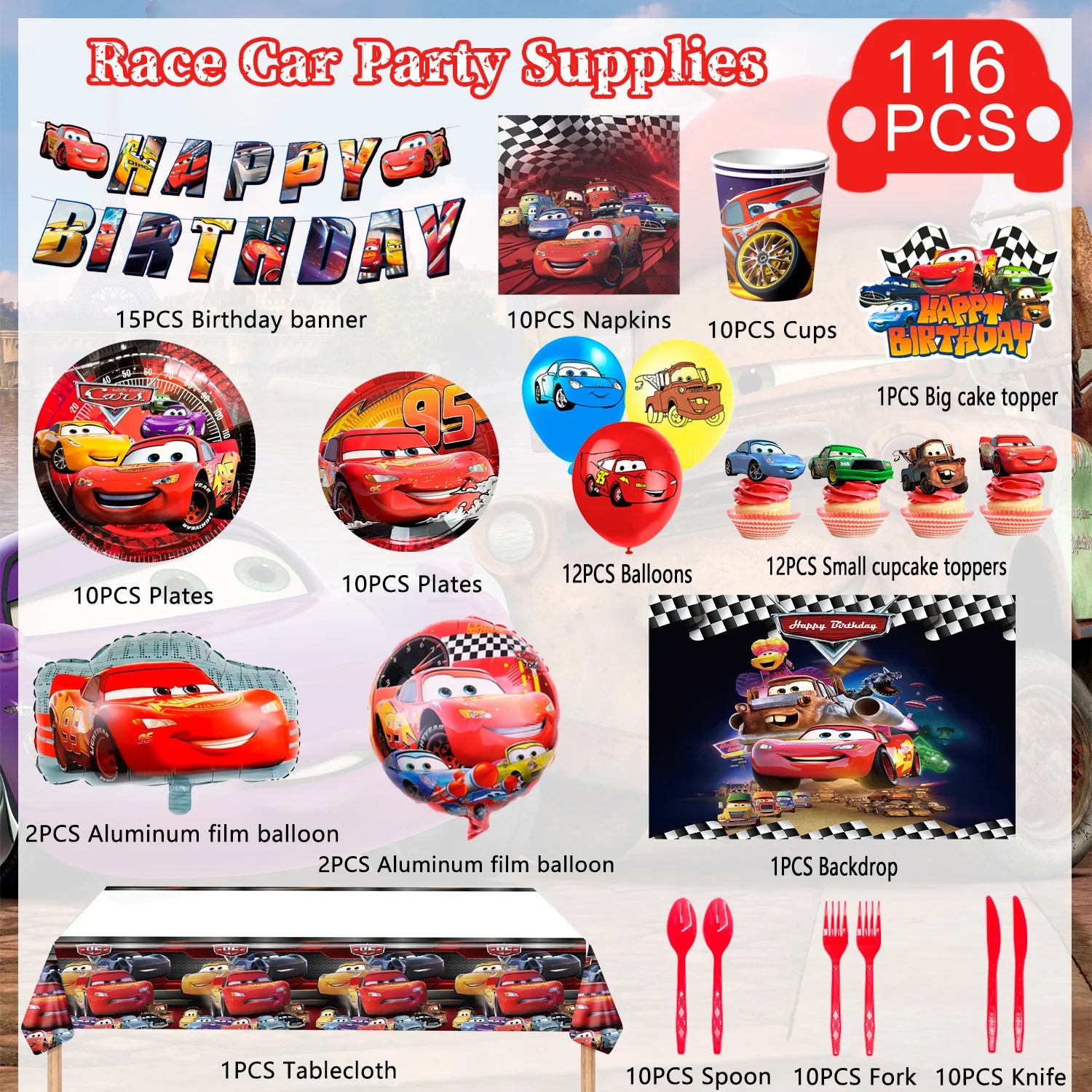 Feiere den Kindergeburtstag mit dem Cars Deko Set voller Spaß! Mit 116 Teilen rund um Lightning McQueen verwandelt es jeden Raum in eine aufregende Rennstrecke. Von bunten Girlanden bis zu thematischen Tellern und Bechern – alles für eine unvergessliche Party, die kleine Rennfahrer begeistert. Ideal für strahlende Augen und fröhliche Momente!