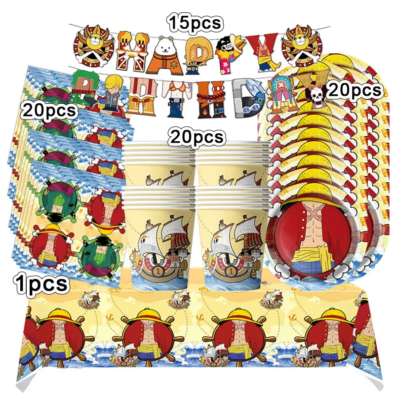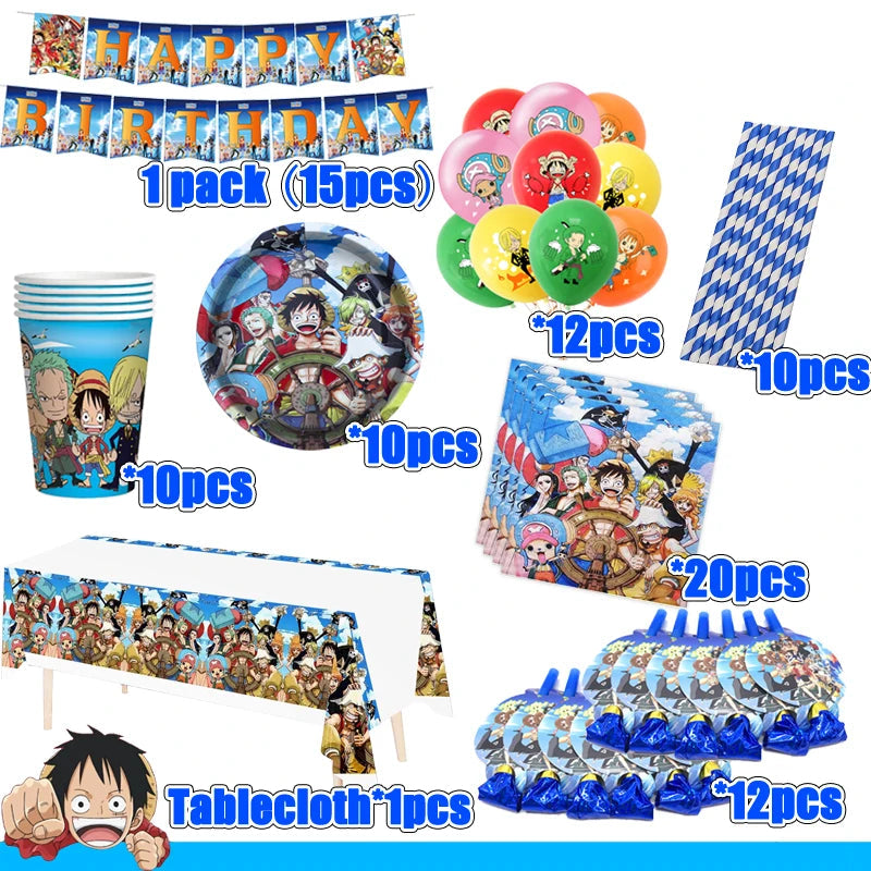 Bringe Spaß und Abenteuer auf deine Geburtstagsparty mit dem One Piece Luffy Deko-Set! Mit bunten Tellern, Bechern, Ballons, Postern und Bannern rund um den beliebten Piraten Luffy wird jede Feier zum echten Highlight. Das komplette Geschirr-Set macht das Essen zum Vergnügen und lässt kleine Fans in die Welt von One Piece eintauchen. Perfekt, um Kinderaugen strahlen zu lassen und die Party unvergesslich zu machen!
