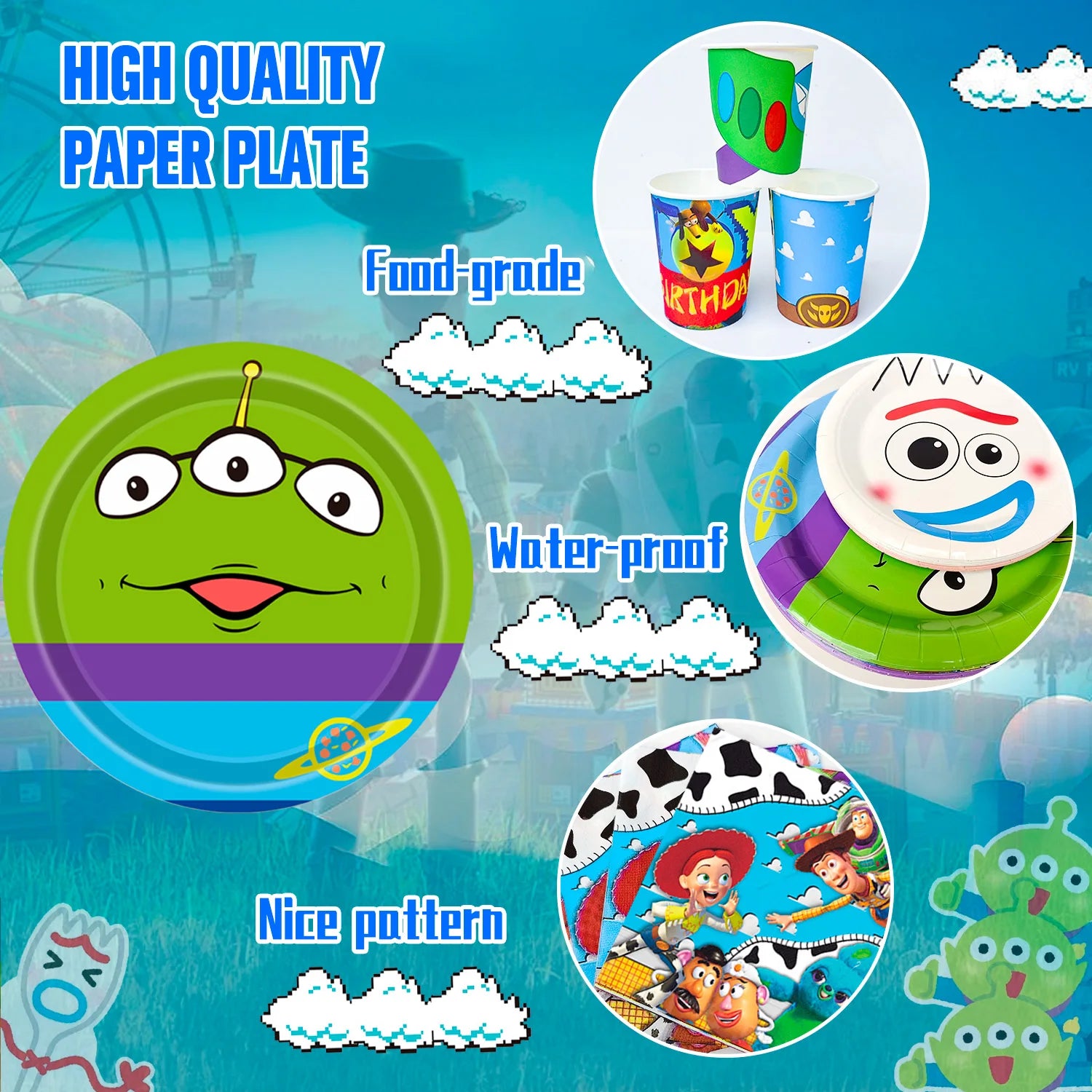 Feiere den nächsten Toy Story Kindergeburtstag mit dem farbenfrohen Toy Story Deko Set! Mit 133 Teilen, darunter Banner, Teller, Becher und Servietten, bringt es den Charme von Woody, Buzz und Co. direkt zu deiner Party. Perfekt, um kleine Fans zum Strahlen zu bringen und eine unvergessliche Atmosphäre zu schaffen. Einfach auspacken und losfeiern!